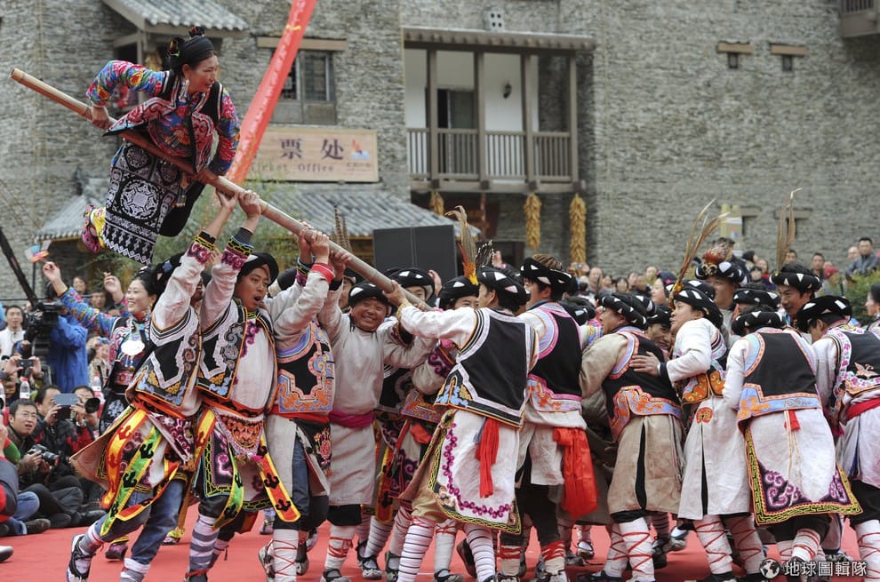 四川的羌族人正在表演慶祝中,人們跟著音樂哼唱跳舞,吹奏笛聲,熱鬧慶祝新年來到