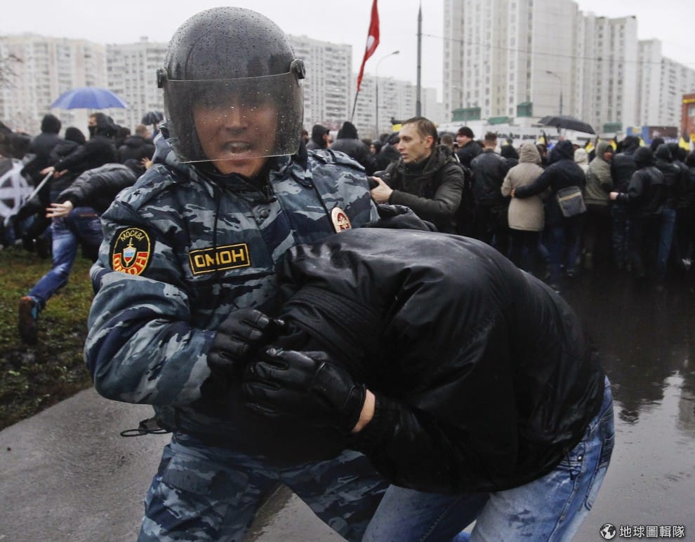 一名警察抓住違法的抗議分子。為了紀念當年擊退波蘭入侵還有俄國統一的日子,當地正舉行慶祝活動,同一時間抗議民眾則舉行「俄國人前行」的示威遊行