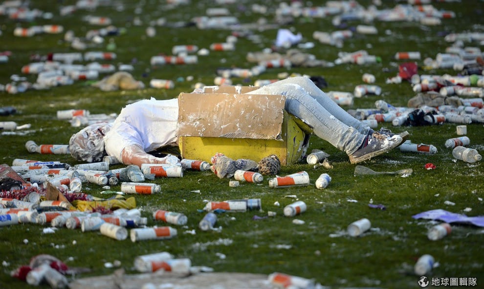 一名學生躺在草坪上,他的身上蓋滿泡沫和紙箱,英國的聖安德魯大學正在舉辦「葡萄乾週」(Raisin Weekend),學生們會在當天進行泡沫大戰