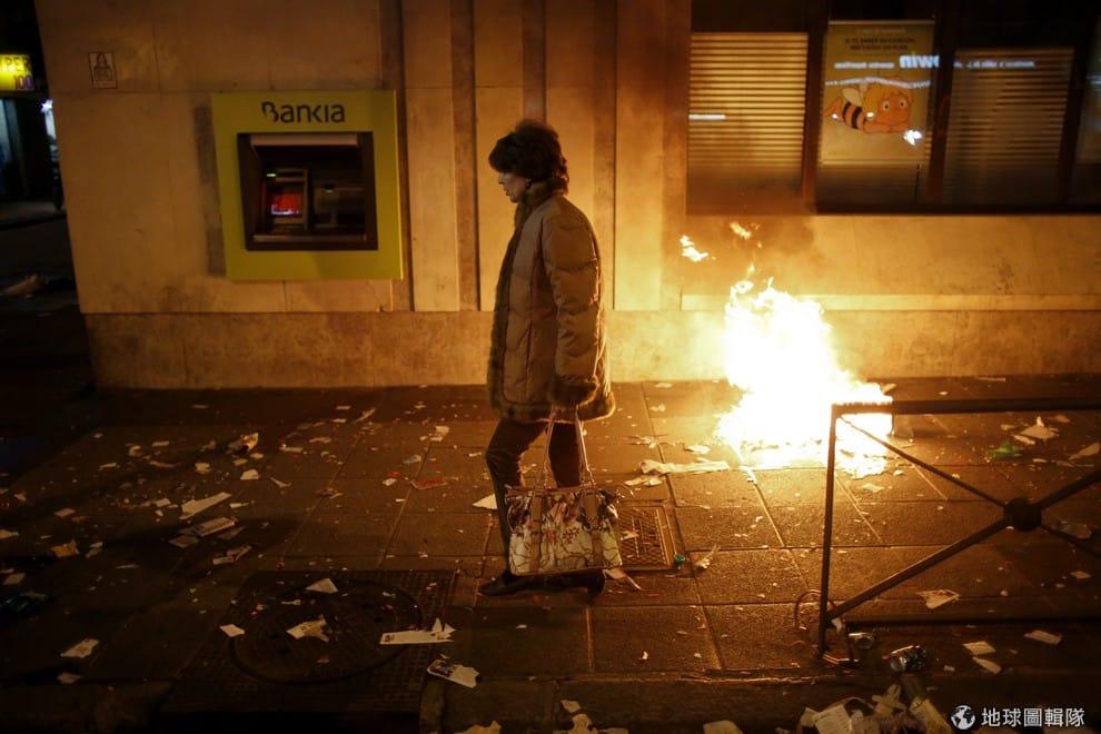 一名女性走過燃火的銀行門前,當地多名市政府員工遭到解雇引起許多人示威抗議