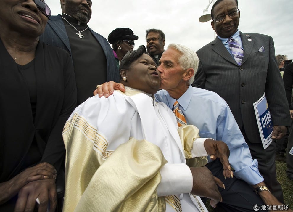 美國前共和黨員克利斯特(Charlie Crist)親吻牧師布朗女士,克利斯特轉為民主黨黨員後備受爭議,他即將參選佛州州長