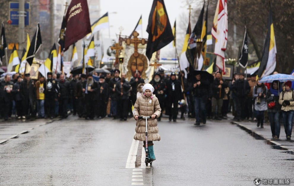 小女孩騎著滑板車走在「俄國人前行」的示威遊行隊伍前