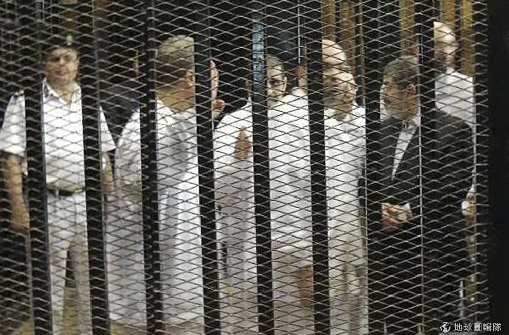 照片中穿黑色西裝的是因為政變被迫下台的埃及前總統穆爾西,他在周一時接受審判,這場判決將會決定他要面對死刑或是終生監禁