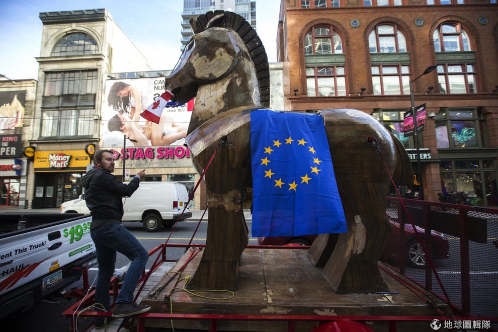 當地的民運分子抗議加拿大和歐盟簽署的經濟貿易協定(the Comprehensive Economic and Trade Agreement)在安大略省當地的交易中行前擺起木馬