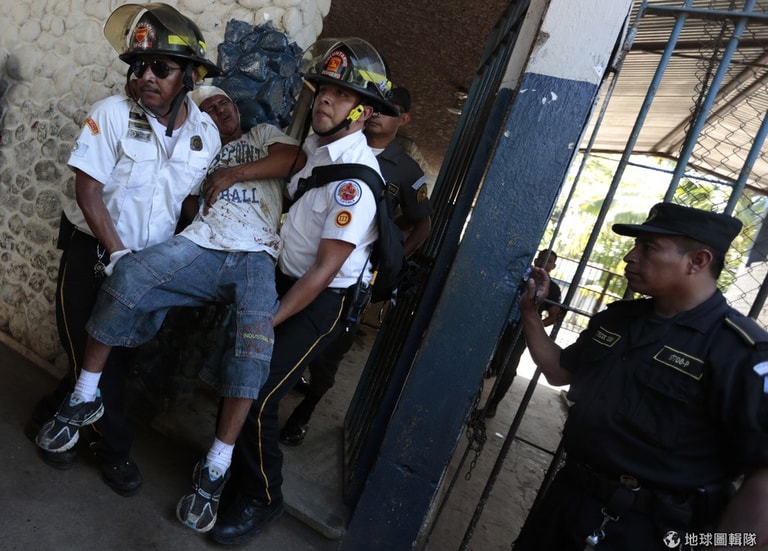 一名受傷的受刑人被抬出監獄外,當地的監獄發生幫派暴動造成至少10名受刑人受傷