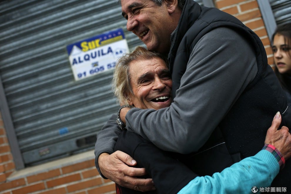 76歲的昆他拿(Luis Dominguez Quintana,左)聽到自己被驅逐的命令被撤銷後,高興地接受一位支持者的擁抱。昆他拿在1994年因為車禍的關係成了「75%無法行動」的人,他必須依靠枴杖行走,1996那年,他以28.6萬歐元買下了房子,2009年時,他因為債務得關閉自己的工廠,他因為無法償還7.5萬歐元的債務即將遭到驅逐,這些日子他找尋管道讓自己的驅逐命令可以暫緩,4號這天他終於得到好消息