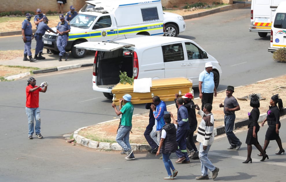 在南非東北部的索維托(Soweto)克里斯·哈尼·巴拉格瓦納斯醫院(Chris Hani Baragwanath hospital)外,幾名警察在遠方看著殯葬員工為了抗議一系列管理法規變動,抬著棺材走上街頭發起罷工。