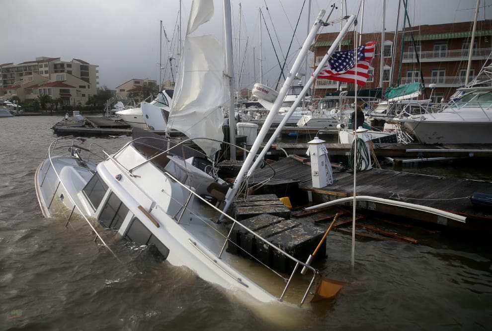 在美國佛羅里達州的彭薩科拉市(Pensacola),颶風莎莉(Sally)帶來的豪雨,讓港邊一艘插著美國國旗的船在水中載浮載沉。