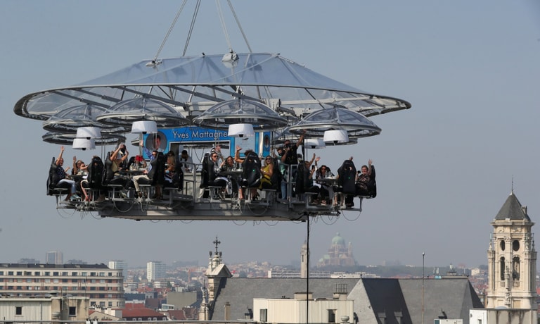 在比利時首都布魯塞爾,32名參加「空中用餐 2.0」(Dinner in the Sky 2.0 New Generation)活動的顧客坐上 9噸重的空中餐桌,讓吊車將餐桌升上 50公尺的高空,同時享受美食及四周的風光。