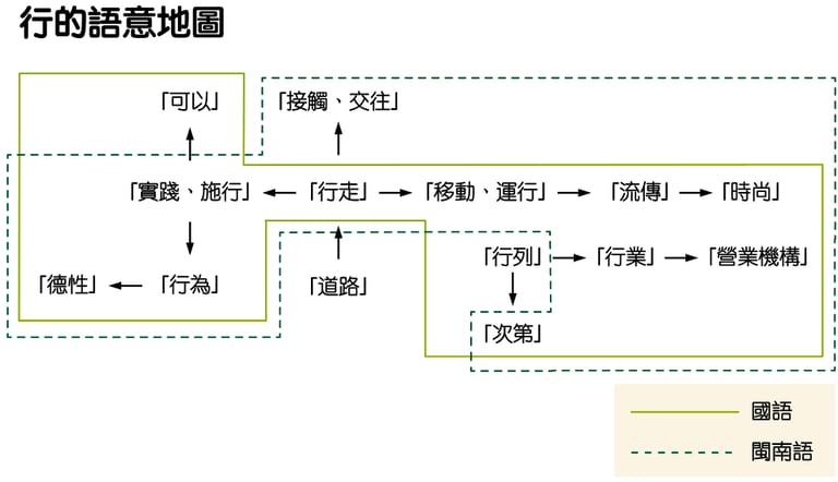 到了現代國語,行走的意思被「走」這個字取代了,只有少數用詞(例如行人)仍保留。但是,國語從移動這個意涵擴充更多用詞:運行、流行,還多了「可以」的意思(你行嗎)。
