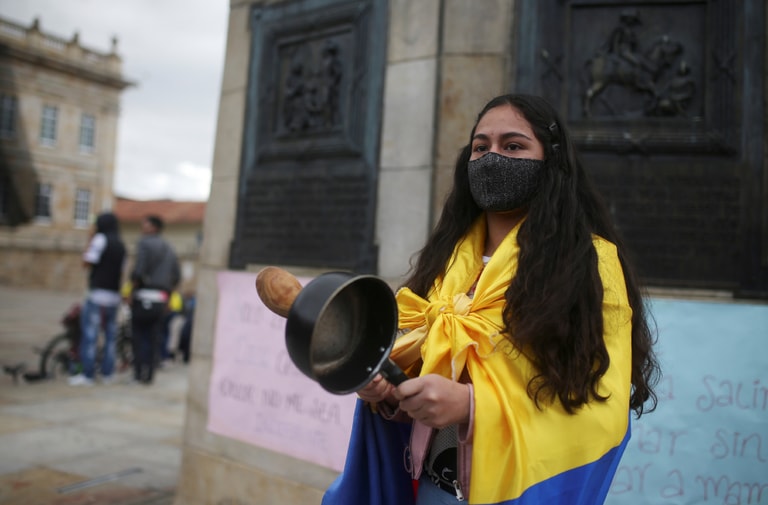 在哥倫比亞首都波哥大(Bogota)街頭,一名女性拿著鍋子湯勺走出家門,響應一場全國大罷工活動。