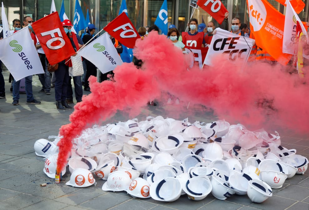 在法國首都巴黎的拉德芳斯商業區(La Defense),水電天然氣供應及廢棄物管理公司蘇伊世(Suez)的員工,將白色安全帽丟在地上並燃起信號彈,抗議對手威立雅環境(Veolia Environnement)收購蘇伊世公司的收購案,員工們害怕會因此而丟掉工作。