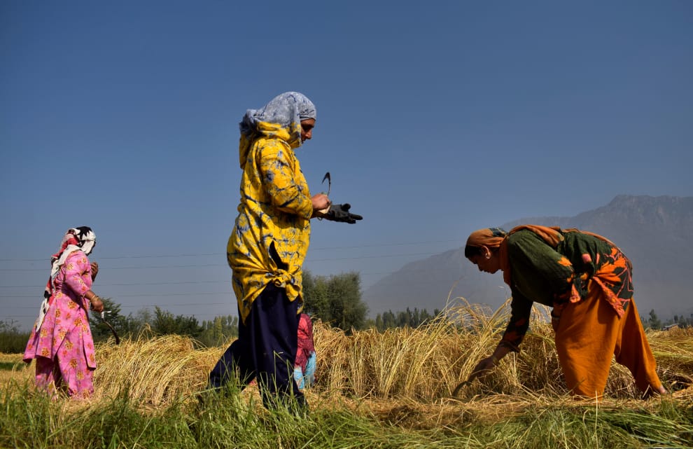 在印度西部喀什米爾地區的斯利那加市(Srinagar),農夫們正在收割稻子。