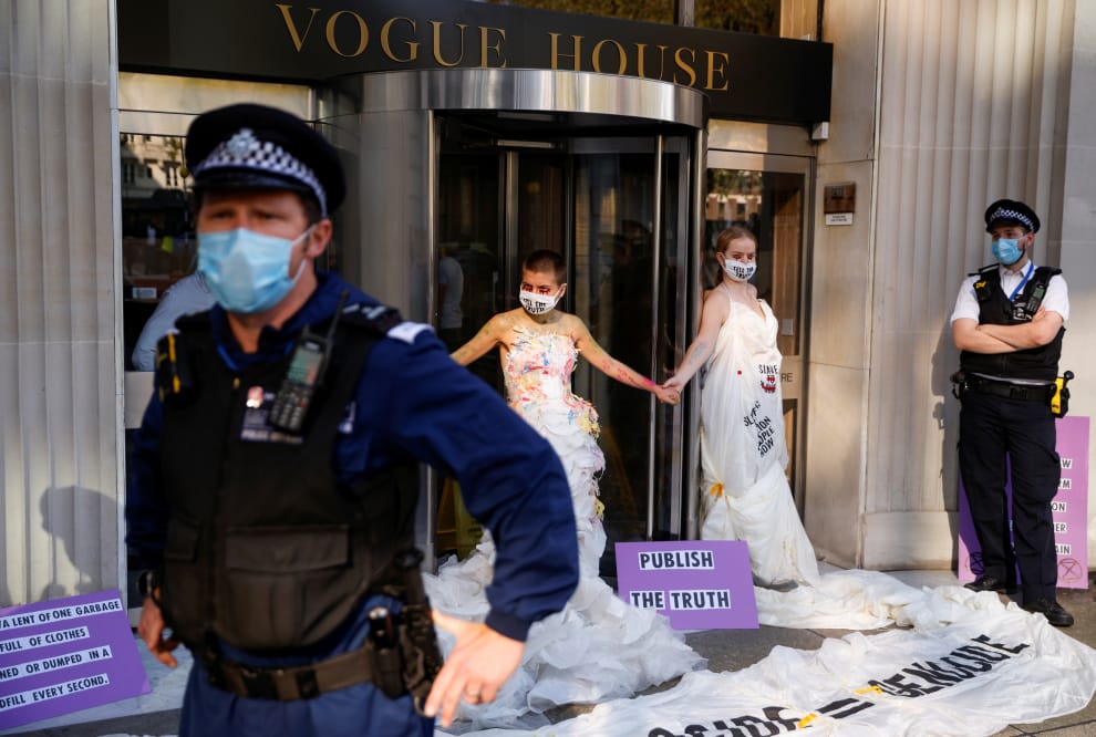 在英國首都倫敦,國際出版集團康泰納仕(Condé Nast)的辦公室Vogue House外,知名環保組織「滅絕反叛」(Extinction Rebellion)的示威者針對時尚產業發起抗爭,將自己黏在Vouge House的大門口,使兩名警察必須到場站崗以維持秩序。