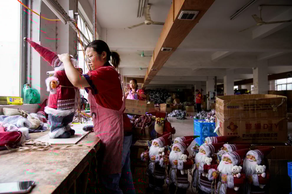 在中國浙江省義烏市的福業玩具工廠(Fuye toy factory,暫譯)內,一名工作人員正在製作聖誕老人的周邊產品。