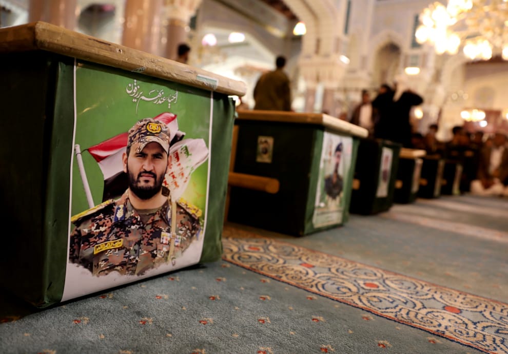 在葉門首都沙那(Sanaa),一口口棺材裡躺著在近期與政府軍交火中陣亡的反政府組織胡西(Houthi)士兵,棺材外貼著陣亡士兵們生前的照片。