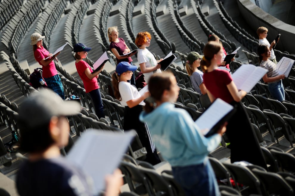 在德國的柏林奧林匹克體育場(Berlin Olympiastadion),柏林德意志歌劇院(Deutsche Oper Berlin)的青少年暨兒童合唱團成員在體育場的座位區彩排。