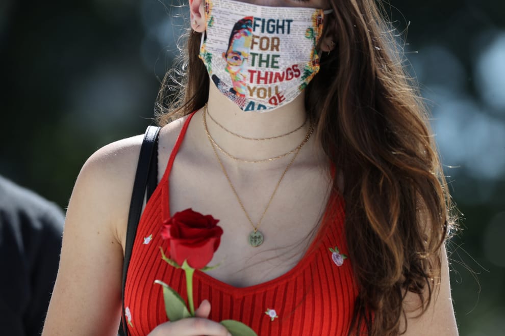 在華盛頓特區的最高法院前,一名女性戴著寫上進步主義標語的口罩和一朵玫瑰,到最高法院前向已故大法官金斯伯格(Ruth Bader Ginsburg)致敬。