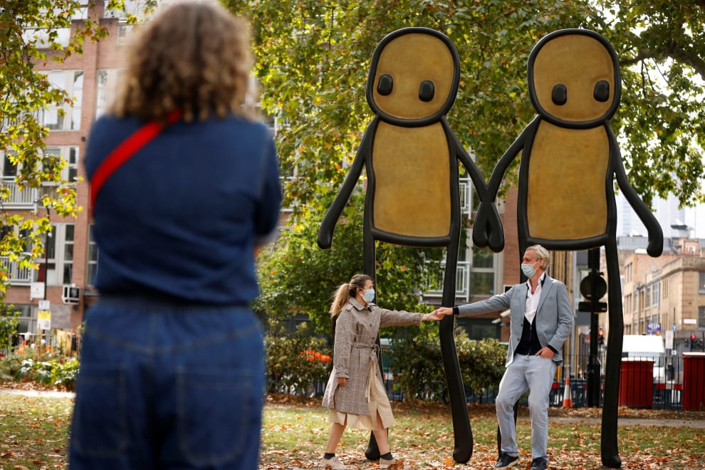 在英國倫敦的霍克斯頓廣場(Hoxton Square),一名攝影師替一對情侶在英國街頭藝術家STIK高達 4公尺的新作品〈牽手〉(Holding Hands)前拍照。