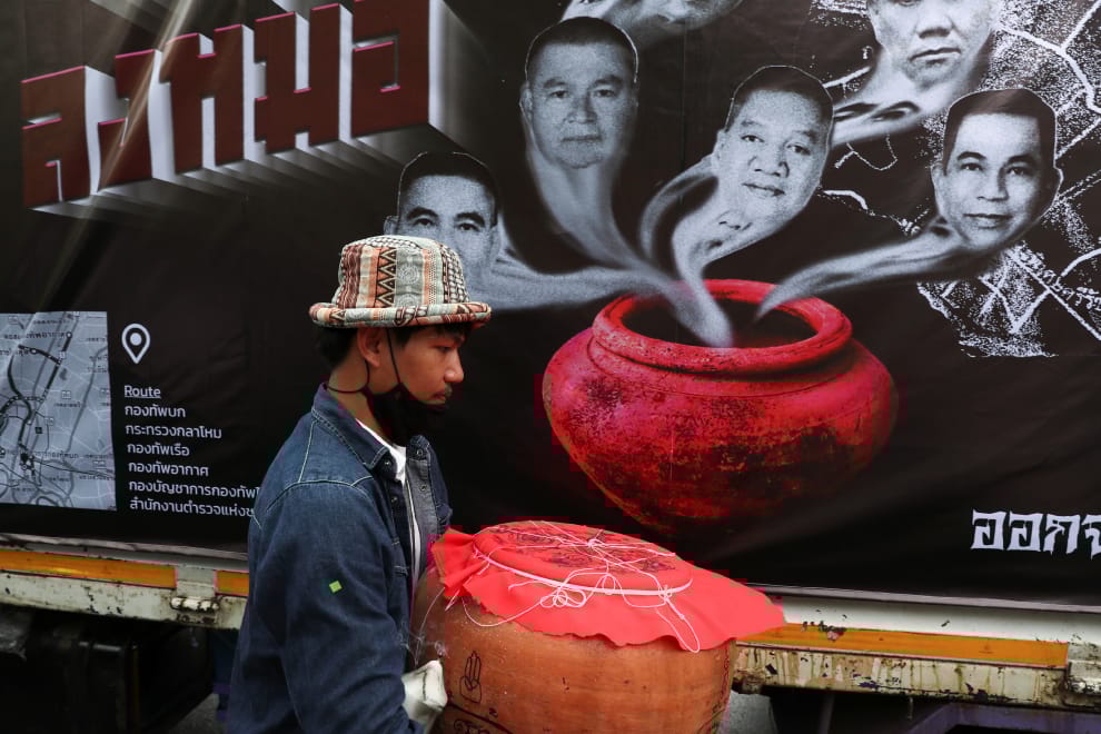 在泰國首都曼谷的泰國皇家陸軍團(Royal Thai Army)總部前,一名參與民主示威的民眾準備進行一場捕捉泰國皇家陸軍領導者們靈魂的儀式。
