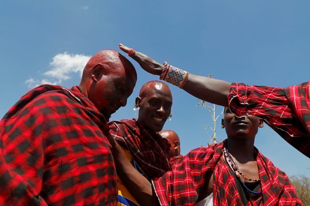 在肯亞南部的卡賈多鎮(Kajiado)的馬帕拉沙丘陵(Maparasha Hills),一名馬賽族男子在參加傳統成年禮Olng'esherr前,讓族人在他頭上塗抹赭紅色的顏料。