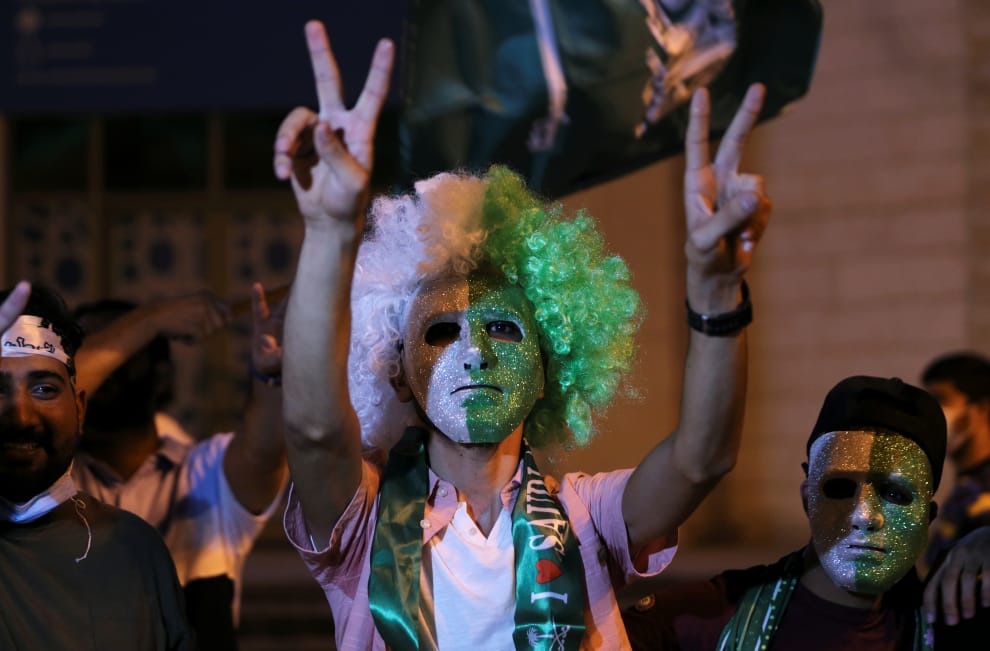 在沙烏地阿拉伯首都利雅德(Riyadh),一名男子戴上假髮、在臉上塗滿白色和綠色的顏料,走上街頭慶祝沙烏地阿拉伯 90周年國慶日。