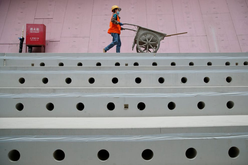 在北京興建中的國家競速滑冰館(National Speed Skating Oval)工地裡,一名女性推著獨輪車經過攝影師的鏡頭前。這座滑冰館預計於 2021年與 2022年分別舉辦世界競速滑冰錦標賽,以及 2022年冬季奧林匹克的競速滑冰比賽。