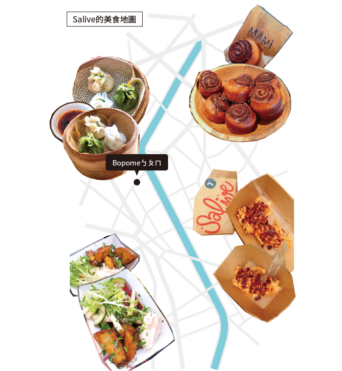 Salive規劃的美食路線裡,大多屬於異國美食。例如:聖馬丁運河路線的第一站就是台灣小吃店Bopomeㄅㄆㄇ,第二站是留尼旺島料理(法國海外屬地、前法國殖民地,飲食文化多受來自印度、中國、非洲移民和法國本土的影響。),其他還有來自非洲、土耳其、地中海、中國的料理,以及猶太點心、法日fusion甜點。除此之外,還有一些鮮為人知的隱藏版巷弄美食,或是主辦單位員工們的口袋餐廳。顧及到吃素或是小鳥胃的顧客,每間餐廳準備的料理都有素食的選項,路線圖更特別貼心地註記一些留到隔天也好吃的料理。