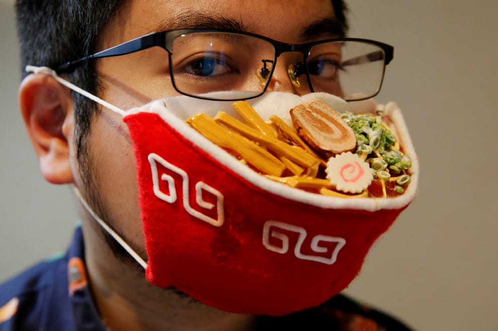 在日本橫濱,日本設計師柴田孝宏(Takahiro Shibata,音譯)戴上了自己設計的拉麵碗造型口罩。如果眼鏡起霧的話,整體效果就更好了!