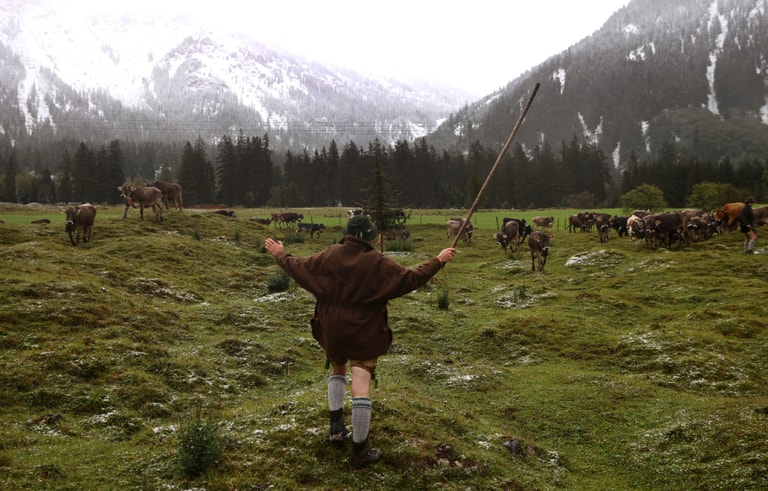 在位於巴伐利亞州的巴特欣德朗鎮(Bad Hindelang),穿著傳統服飾的牧牛人正在將牛群從夏日草場趕往秋季草場,這樣的趕牛活動稱為「Almabtrieb」,是秋季歐洲地區的高山盛事。