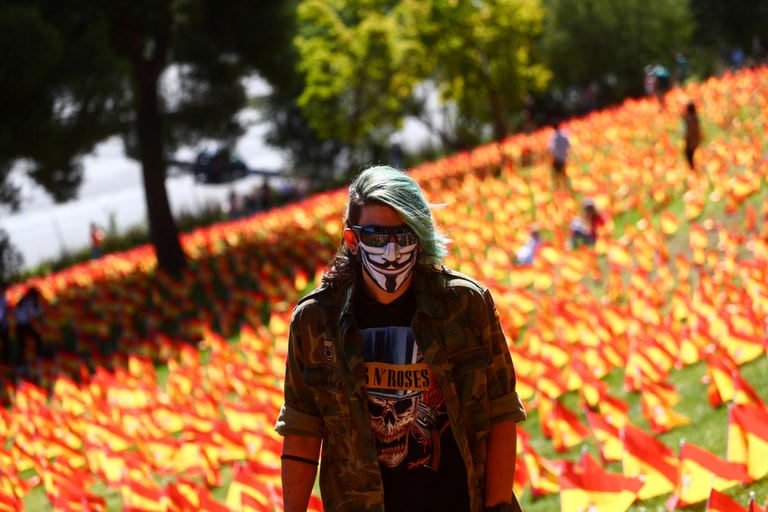 在馬德里一處公園內,地上插著一支支悼念COVID-19(武漢肺炎)罹難者的國旗。