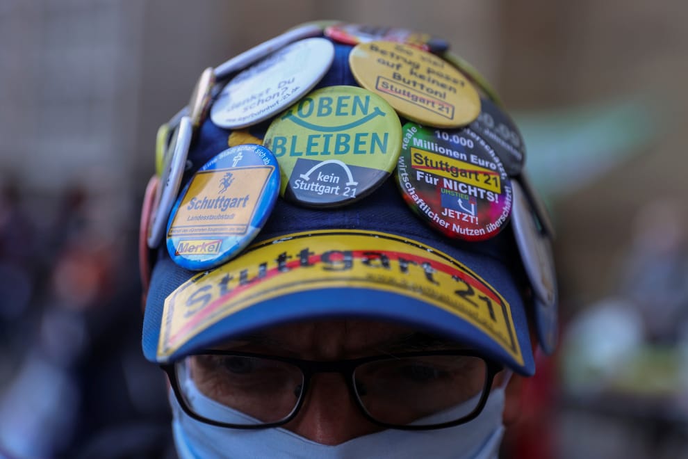在巴登-符騰堡邦的司徒加特(Stuttgart),反對「司徒加特 21」(Stuttgart 21)新火車站開發案的民眾上街抗議。「司徒加特 21」希望將老舊的火車總站改建為能夠連接歐洲高鐵的地下貫穿式車站,然而這麼做會切斷城市內的公園綠地,這也是市民反對該開發案的主因。