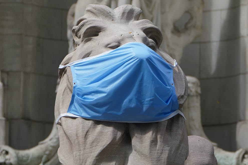 在紐約市曼哈頓行政區的紐約公共圖書館外,一頭石獅子戴起了藍色口罩宣導防疫的重要。目前,美國已經有超過 20萬人死於COVID-19(武漢肺炎)。