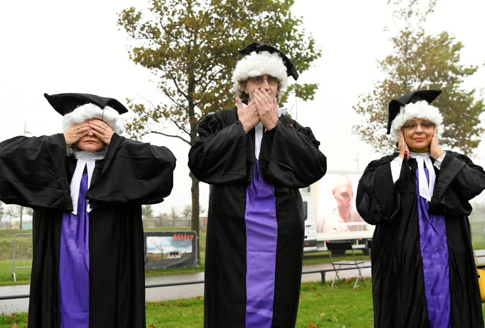 在巴德胡弗多普(Badhoevedorp)的史基浦法院建築群(Schiphol Judicial Complex)外,抗議法院沒有好好審理馬來西亞航空MH17班機遭擊落一案的民眾,穿上法官袍比出諷刺的姿勢。