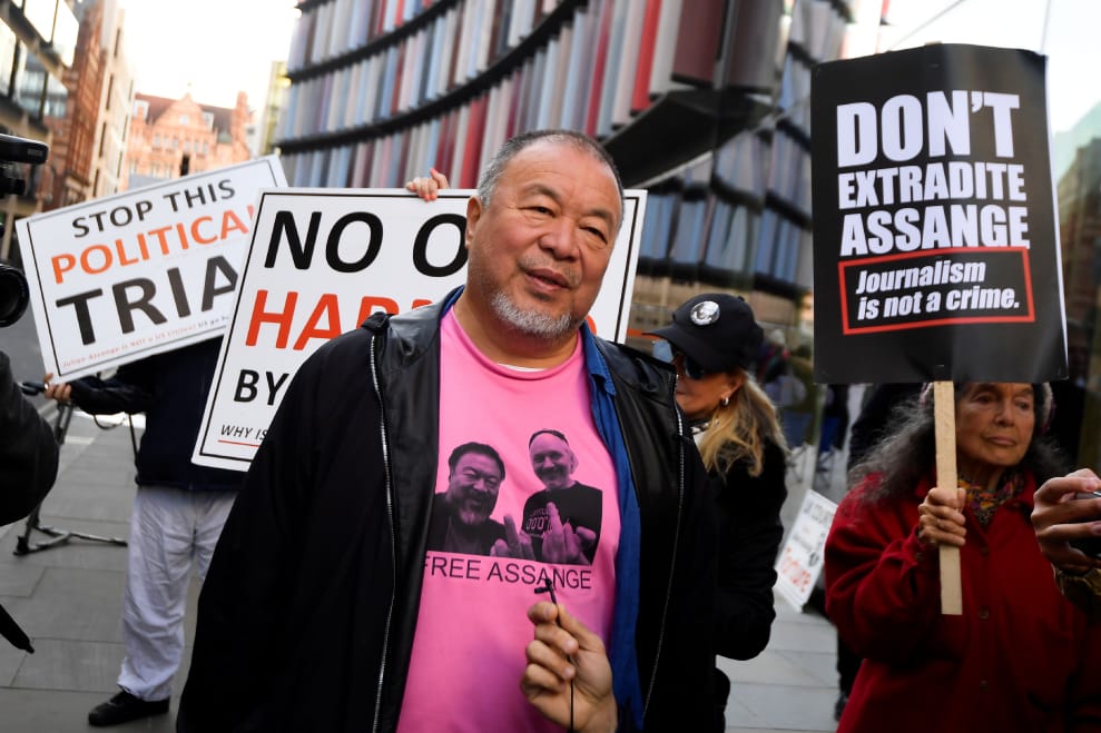 在倫敦中央刑事法院外,中國藝術家艾未未出面支持聲援《維基解密》(WikiLeaks)的創辦人阿桑奇(Julian Assange),反對將阿桑奇引渡到美國受審,一旁阿桑奇的支持民眾則手舉寫有「新聞不是犯罪」、「不要引渡阿桑奇」字樣的牌子。如果引渡成立,阿桑奇可能面臨多達 18項罪名指控。