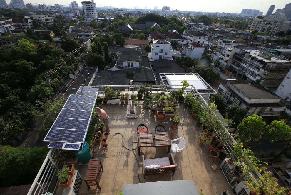 德國推行的「綠屋頂」能提供不少優點,除了能利用太陽能發電、供暖,植物蒸散作用產生的水還能反向替太陽能板降溫,改善效率。屋頂上的植物,也能有效改善生物多樣性。圖為泰國一名將屋頂設計為綠屋頂的屋主,正在外頭澆花。
