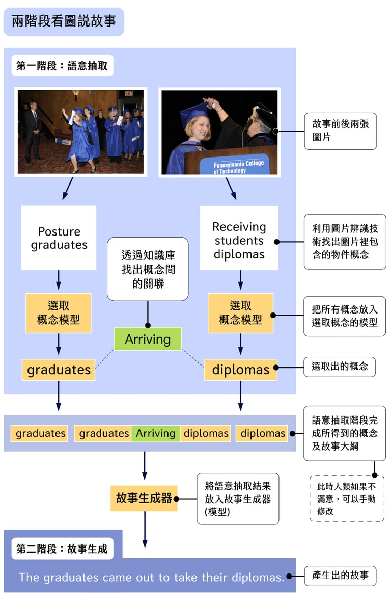 在軍備競爭不足的情況下,古倫維決定採取不同的策略:「既然完全由 AI 看圖說故事的效果不夠好,能不能在故事生成的過程中,有一個人類可以介入改善的步驟。」所以她把原來的做法分成了兩個階段,先從圖片抽取語意,接著再生成文字故事。