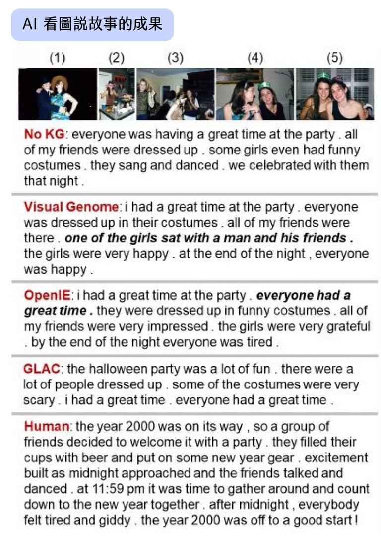更重要的是,知識庫讓 AI 更容易解讀出圖片之間的關聯。如 VIST 競賽的題目就是包含了五張圖片的圖組,在知識庫的協助下, AI 比較容易找出各別圖片的概念之間的關聯,說出的故事會比較連貫,具有因果關係。
