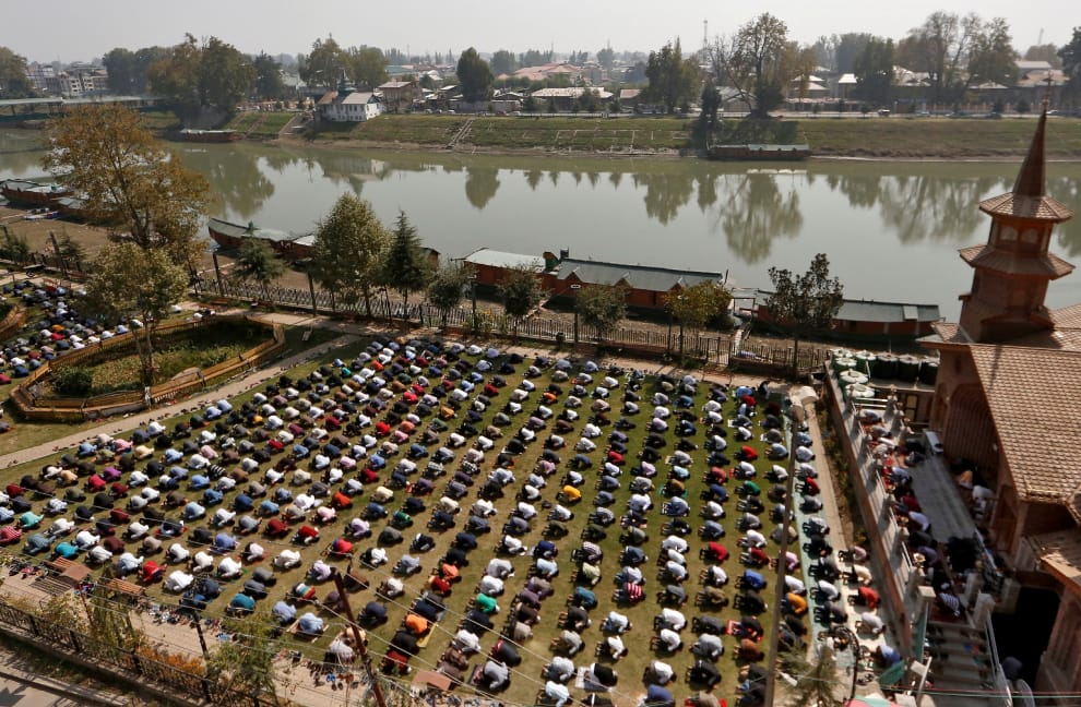 在西部喀什米爾地區的斯利那加市(Srinagar),穆斯林們在一座清真寺前舉行周五禱告。