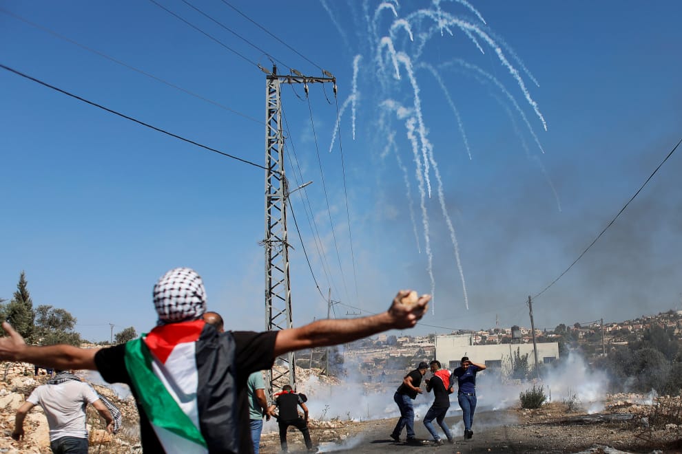 在約旦河西岸、遭到以色列佔領的卡法爾卡達姆城鎮(Kafr Qaddum),巴勒斯坦抗議民眾遭到以色列軍隊發射的催淚瓦斯驅離現場。
