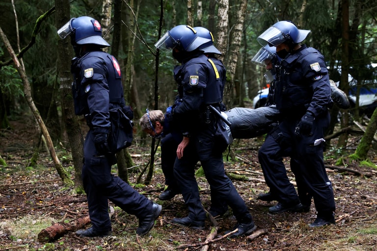 在靠近黑森州施塔特阿倫多夫小鎮(Stadtallendorf)的一座森林內,警察將抗議擴張A 49高速公路的環保人士驅離現場。