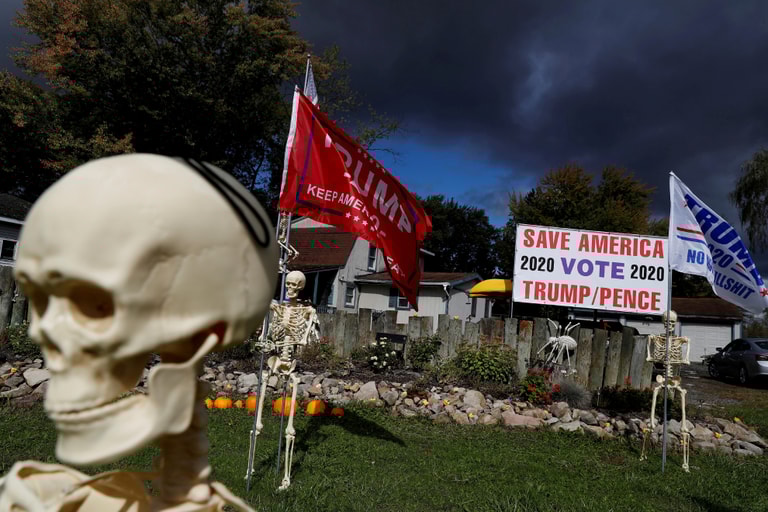 在俄亥俄州的沃倫市(Warren),美國總統川普(Donald Trump)的支持者喬瑟夫(Maranda Joseph)在自家庭院擺上骷髏迎接萬聖節的同時,也不忘請骷髏幫川普拉票,呼籲路過民眾在今年十一月的總統大選中投票給川普。
