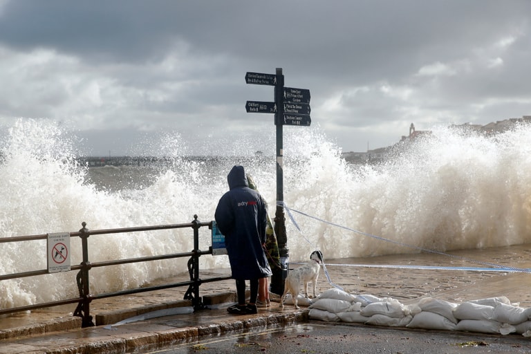 在英吉利海峽北部的多塞特郡(Dorset),人們看著亞歷克斯颶風(storm Alex)捲起的大浪。