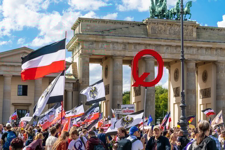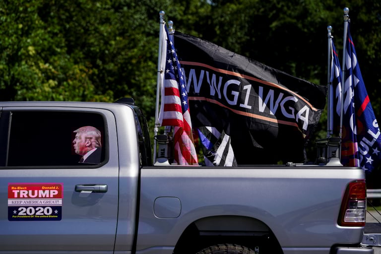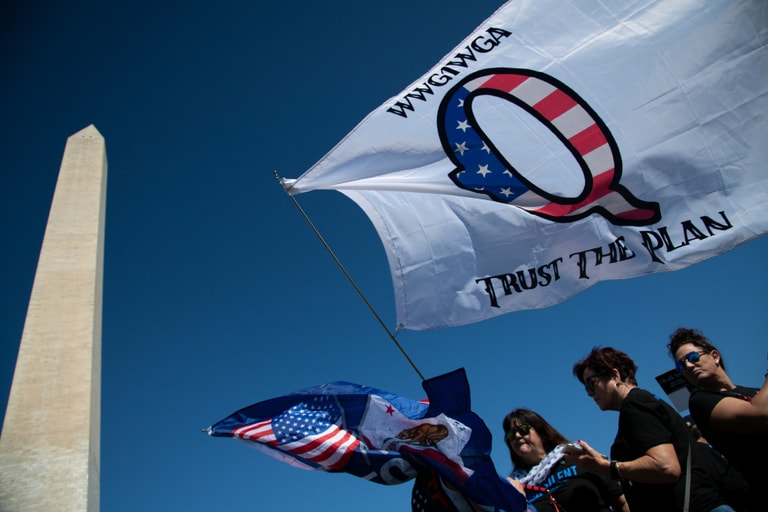 這群人是QAnon的支持者,他們相信一系列的陰謀論,這些陰謀論從 2017年開始在網路上發酵,趁著疫情期間、社會不穩的時候再次回到鎂光燈下。