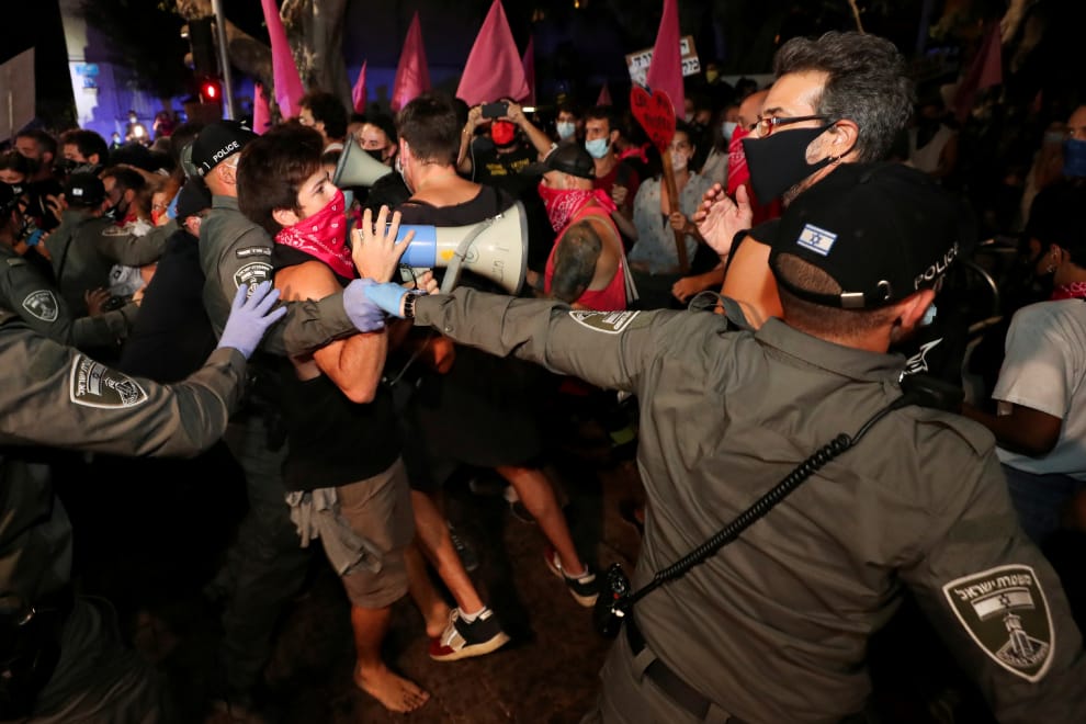 在特拉維夫,抗議總理納坦雅虎(Benjamin Netanyahu)貪汙的民眾和警察發生推擠衝突,他們一塊上街反對政府下達的防疫限抗令——要抗爭可以,但只能在離家一公里內,這樣的命令被抗議民眾視為以防疫為由,行限制民權之實。