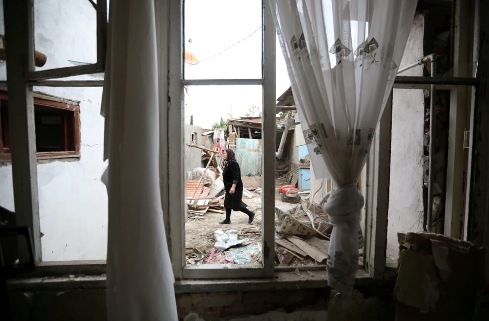 在位於亞塞拜然西北部的第二大城占賈(Ganja),一名女子走過遭到亞美尼亞軍隊轟炸的家園。