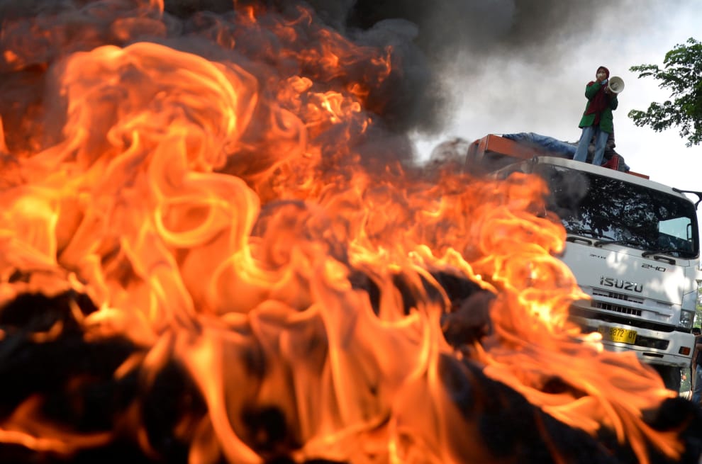 在南蘇拉威西省首府錫江(Makassar),一名抗議民眾站在聯結車上示威,反對政府提出的創造就業法案,該法案將放寬環境和勞動限制以吸引投資人,批評者認為這將傷害勞工權益,包含勞工的資遣費、特休會變少,工時會變長,以及原本屬於正職的工作將被派遣人員取代等。