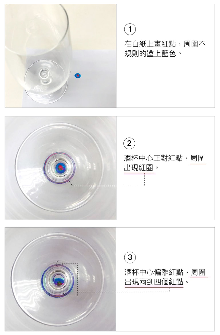 松下聰樹以一個高腳酒杯和一張紙,巧妙解釋這個神秘的天文現象。他在白紙上畫了一個紅點,周圍不規則的塗上藍色。接著把酒杯放在圖案上,如果酒杯中心正對著紅點,那我們透過酒杯底座 (扮演透鏡),可以看到藍色的環帶中間,顯現出一個完整清晰的紅圈。如果酒杯中心稍微偏離紅點,則會看到兩個或四點構造,散落在不對稱的藍色圓弧之中。讀者不妨自己在家做實驗!