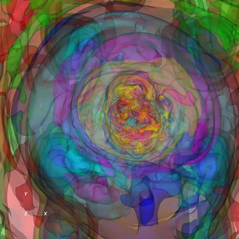 陳科榮從 2015 年就投入磁星驅動超新星的模擬研究,展示其爆炸過程,立刻面臨一個巨大的難題:在此之前的研究都是一維度模型,也就是假設「磁星驅動超新星的流體分佈」是球對稱,所有方向的變化都一樣。但真實過程當然沒有這麼簡單,磁星的輻射壓力會突然把物質劇烈地往外推,形成流體力學的不穩定結構,就像是把墨水滴在水裡,可見多變複雜的結構。但一維模型的結果就像剷雪,只能將大量物質擠在非常小的區域,無法判讀箇中細節。陳科榮比喻: