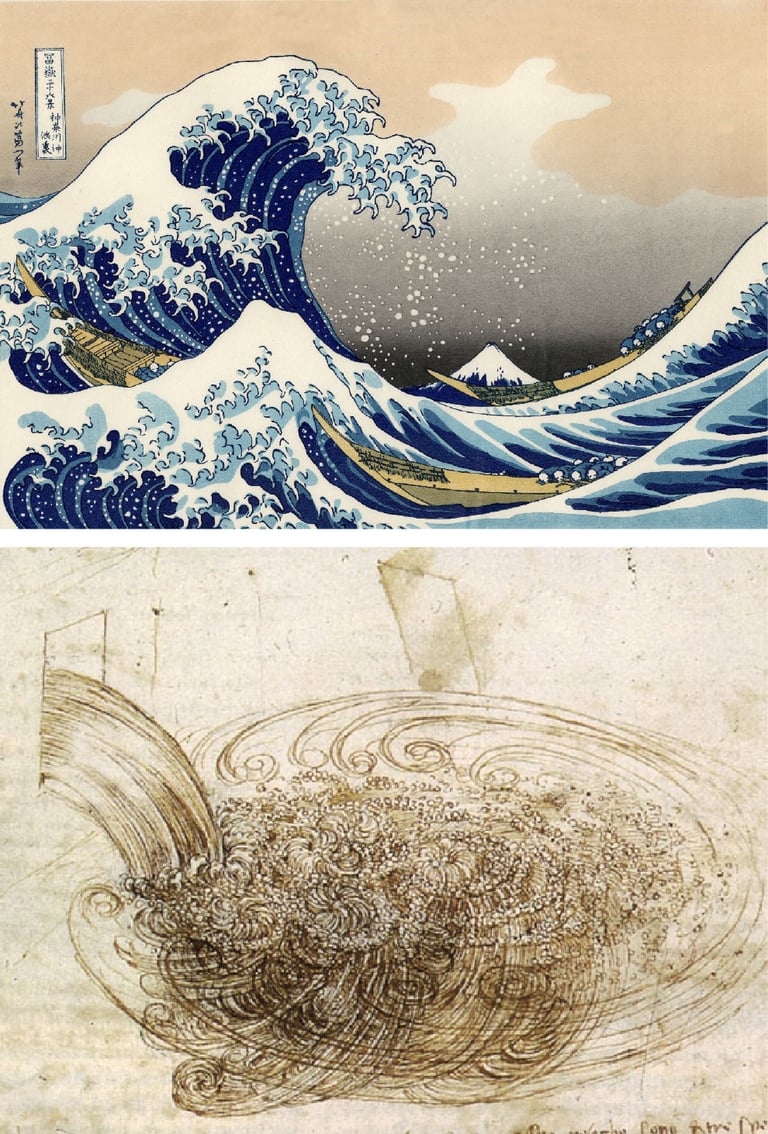 陳科榮又舉例,在葛飾北齋著名的浮世繪《神奈川沖浪裡》,海浪的尾端有許多破碎的複雜結構,真實的流體即是如此複雜,而這幅畫還只是偏向二維結構。三維流體的紊流更複雜,只有達文西這樣的天才,可以將其生動地描繪出來。